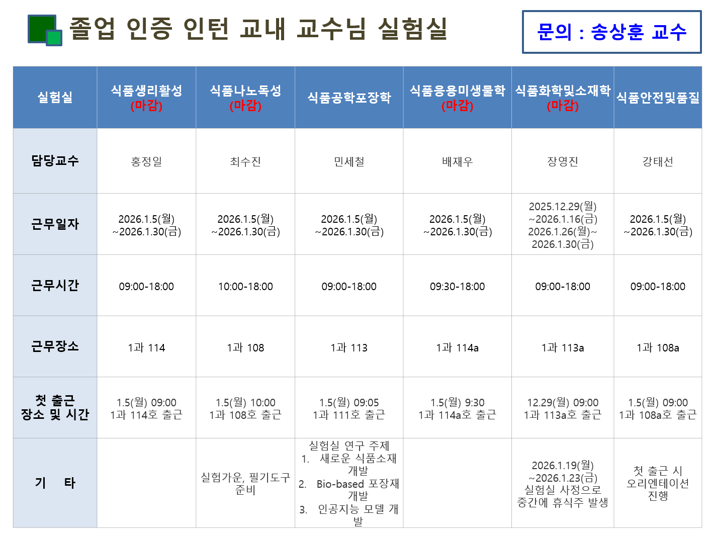 * 교내 실험실 추가모집은 12월 12일(금) 오후 3시까지 신청 받을 예정입니다. 선발 여부는 12월 12일(금) 오후3시 이후에 안내 예정입니다.