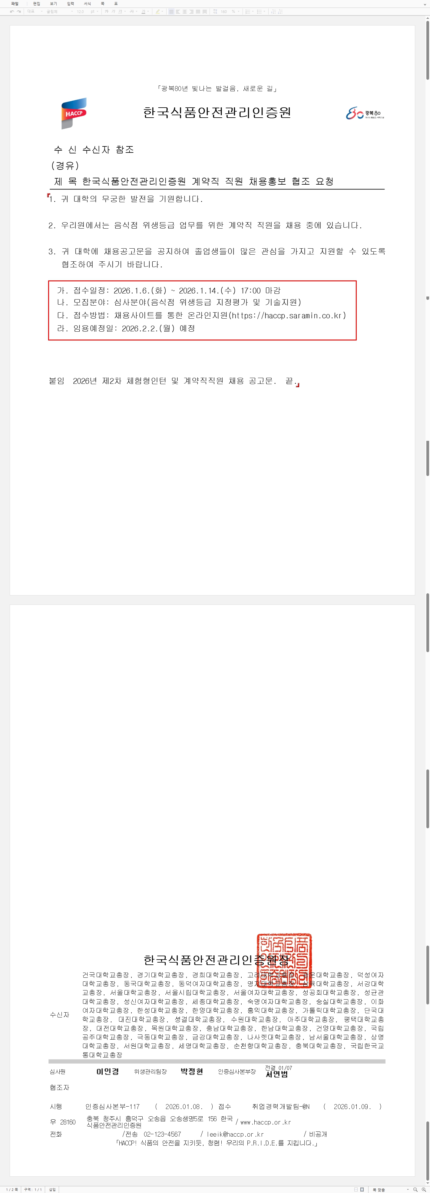 [채용] 한국식품안전관리인증원 계약직 직원 채용