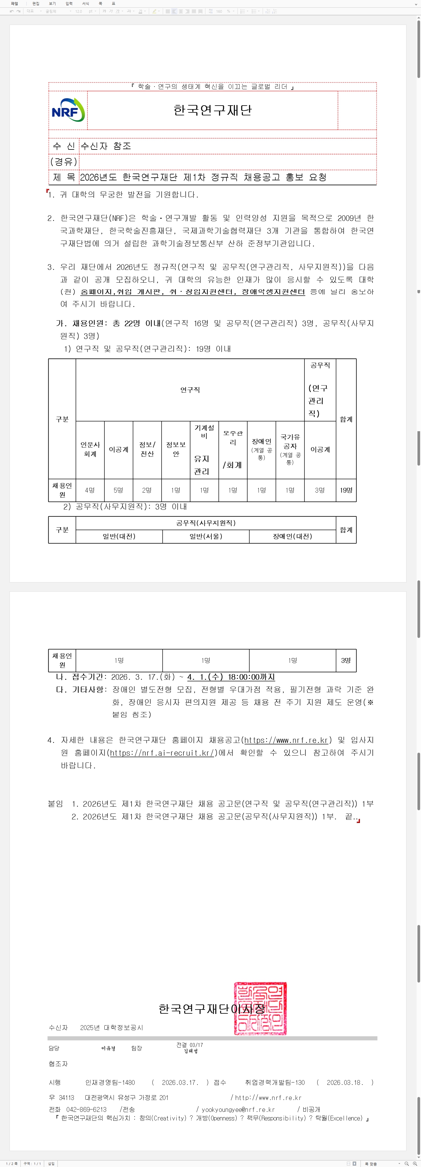 [채용] 2026년도 한국연구재단 제1차 정규직 채용 공고(~4/1 6PM)